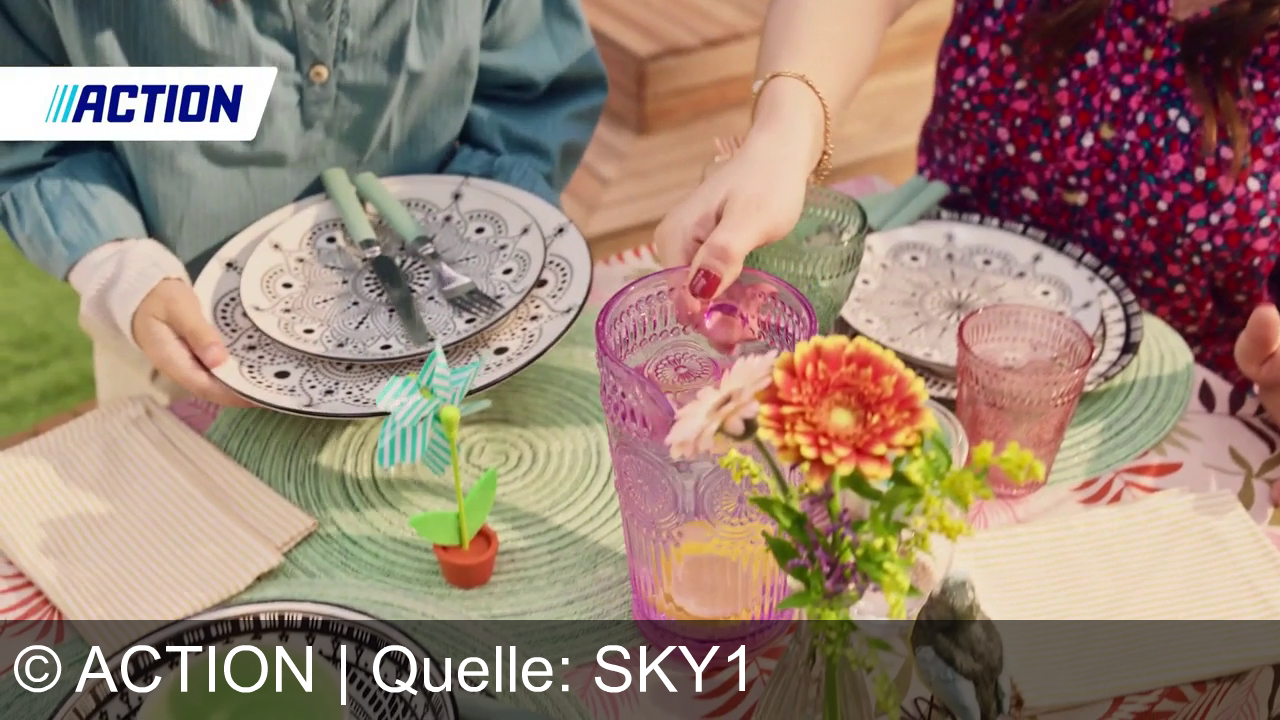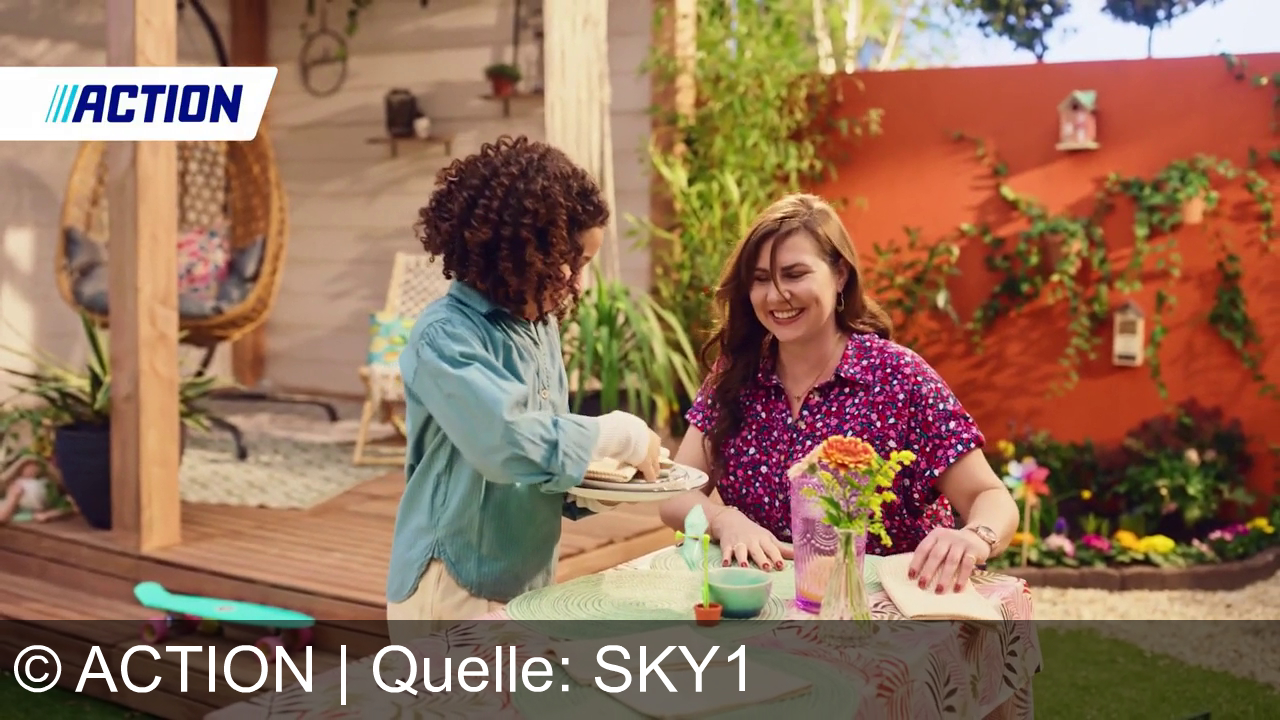 Zwei Personen sitzen an einem Tisch im Garten. Eine Person steht und serviert einen Teller, die andere sitzt lächelnd davor. Der Tisch ist mit farbenfroher Tischdecke gedeckt, darauf eine Vase mit Blumen. Im Hintergrund viele Pflanzen, Holzmöbel und eine orangefarbene Wand. Oben links ein Logo mit "ACTION".