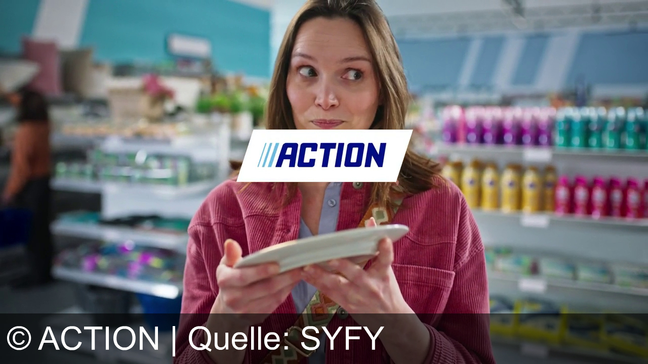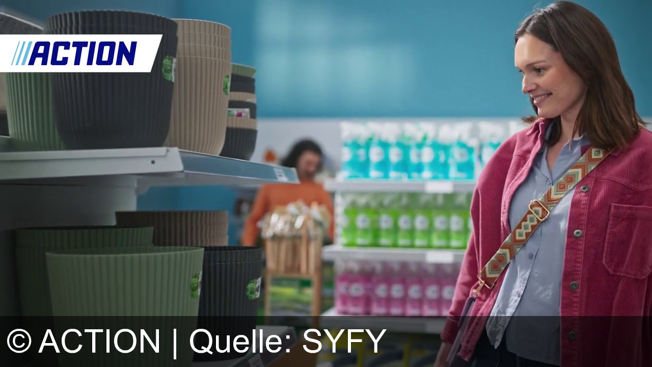Eine Frau mit brauner Jacke hält ein weißes Objekt in den Händen und steht in einem Geschäft mit Regalen voller Produkte im Hintergrund. Vorne ist das Wort "ACTION" in blauer Schrift auf einem weißen Balken platziert.