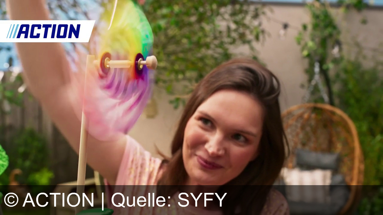 Eine Frau hält ein buntes Windrad und lächelt. Im Hintergrund sind grüne Pflanzen und ein Rattan-Hängesessel zu sehen. Oben links steht "ACTION" in blauer Schrift.