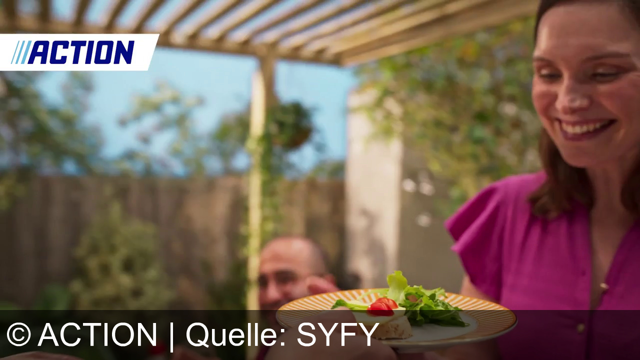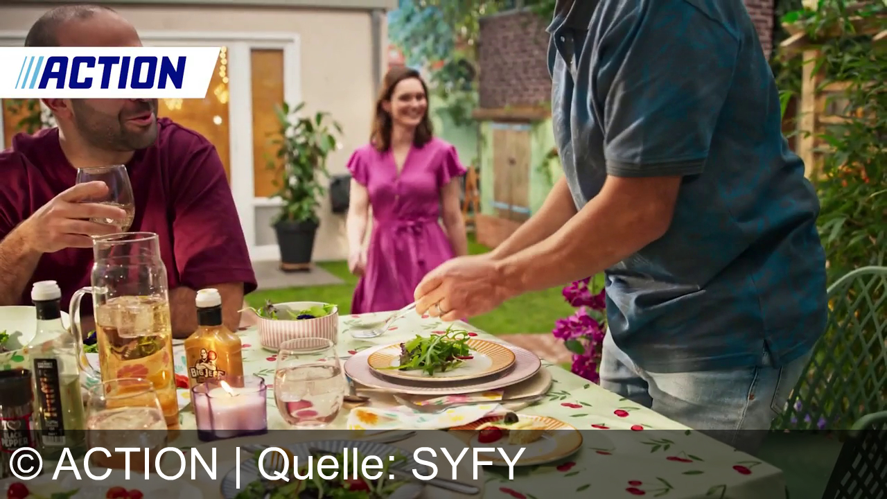 Eine Frau in lila Bluse lächelt und hält einen Teller mit belegten Häppchen. Im Hintergrund sitzt ein Mann und lacht. Die Szene spielt sich draußen ab, unter einer Pergola mit Pflanzen. Oben links steht "ACTION" im Bild.