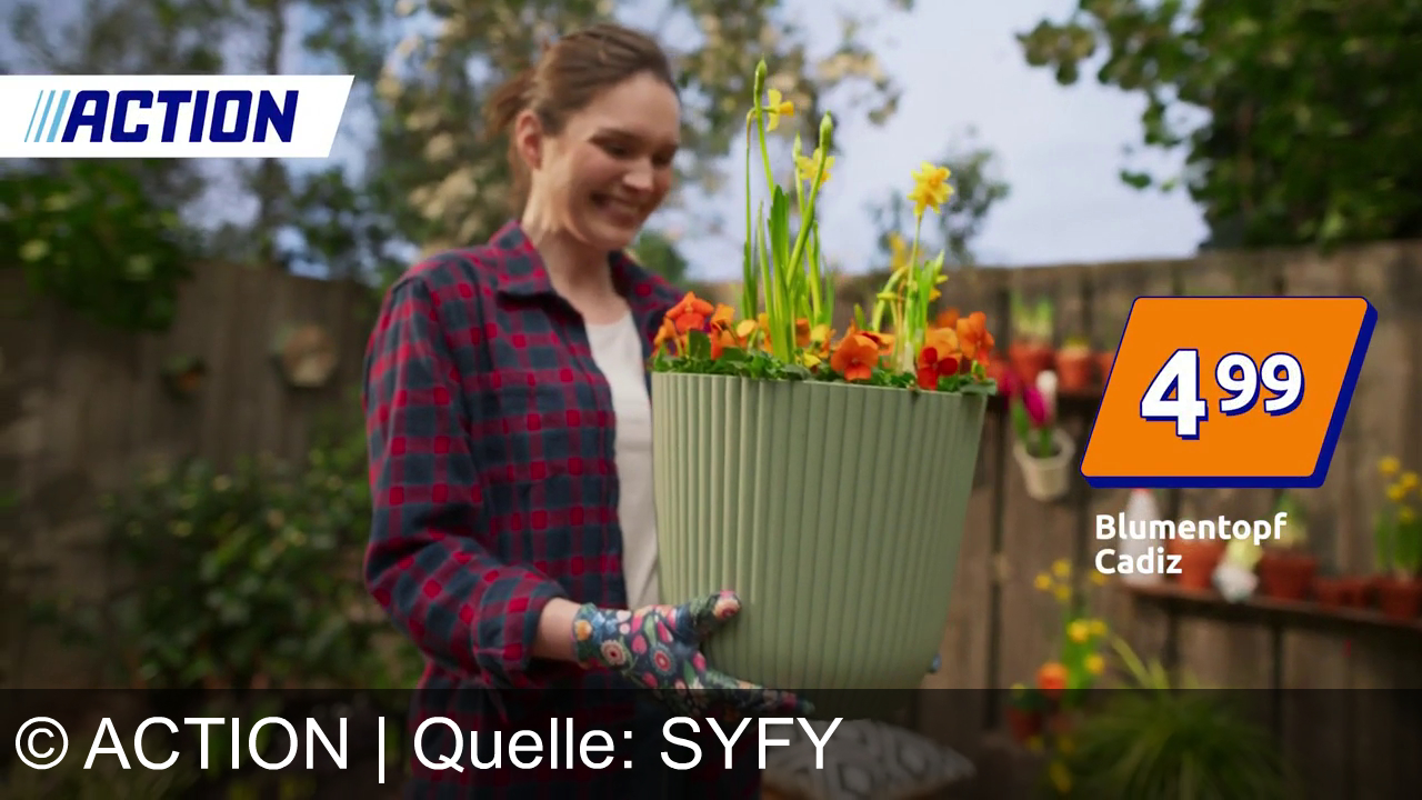 Eine Frau steht im Garten und hält einen grünen Blumentopf mit bunten Blumen. Sie trägt eine karierte Jacke und bunte Handschuhe. Oben links ist ein Logo mit der Aufschrift "ACTION" zu sehen. Rechts im Bild steht der Preis von 4,99 Euro und der Text "Blumentopf Cadiz". Im Hintergrund sind verschwommene Pflanzen und ein Zaun sichtbar.