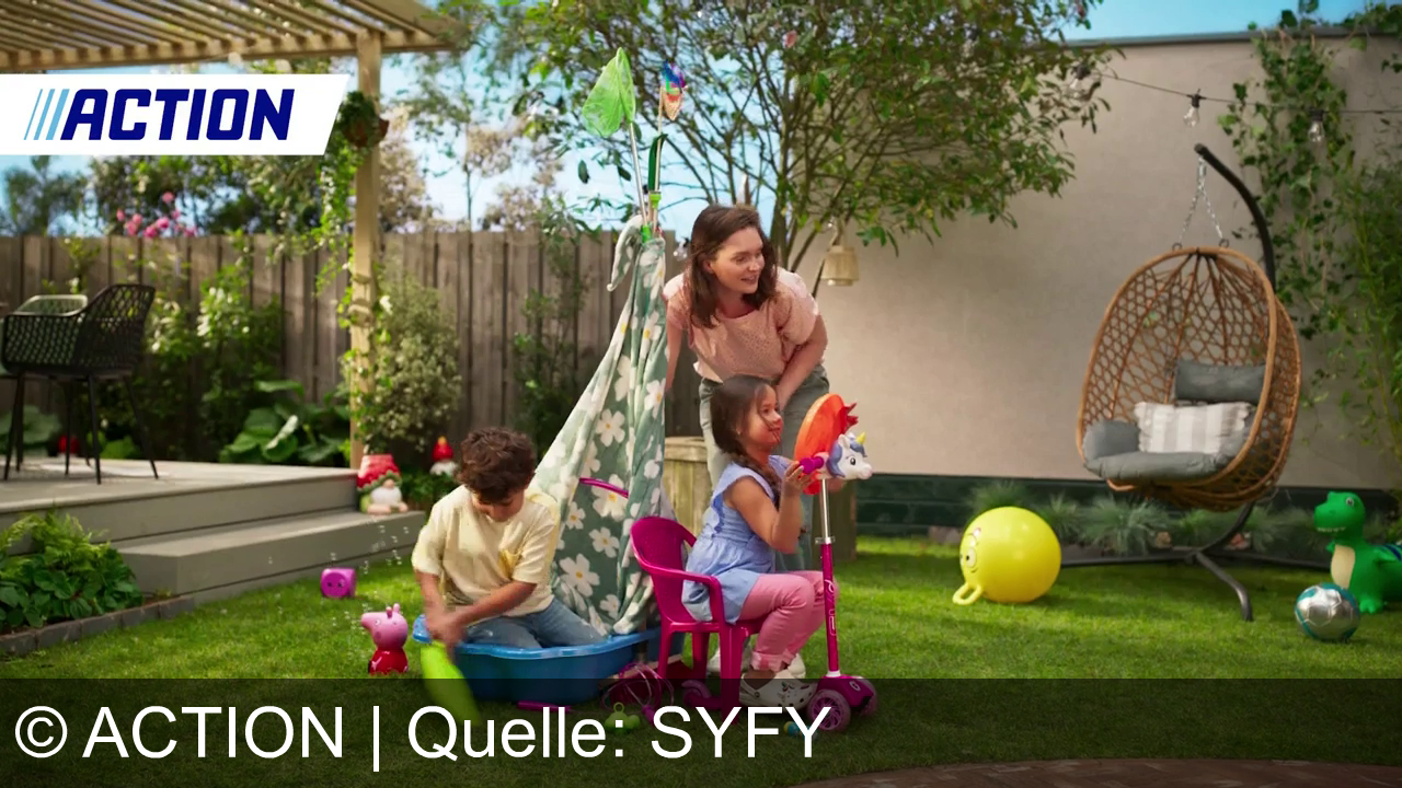 Im Garten spielen zwei Kinder. Eines sitzt in einem rosa Stuhl mit einem Einhornroller, das andere ist in einer blauen Wasserschale. Eine Frau lehnt sich zum Lächeln vor. Im Hintergrund gibt es ein Zelt, einen hängenden Sessel und einige Spielzeuge auf dem Rasen. Auf der linken Seite sind eine Terrasse und Pflanzen zu sehen. Oben links steht "ACTION".