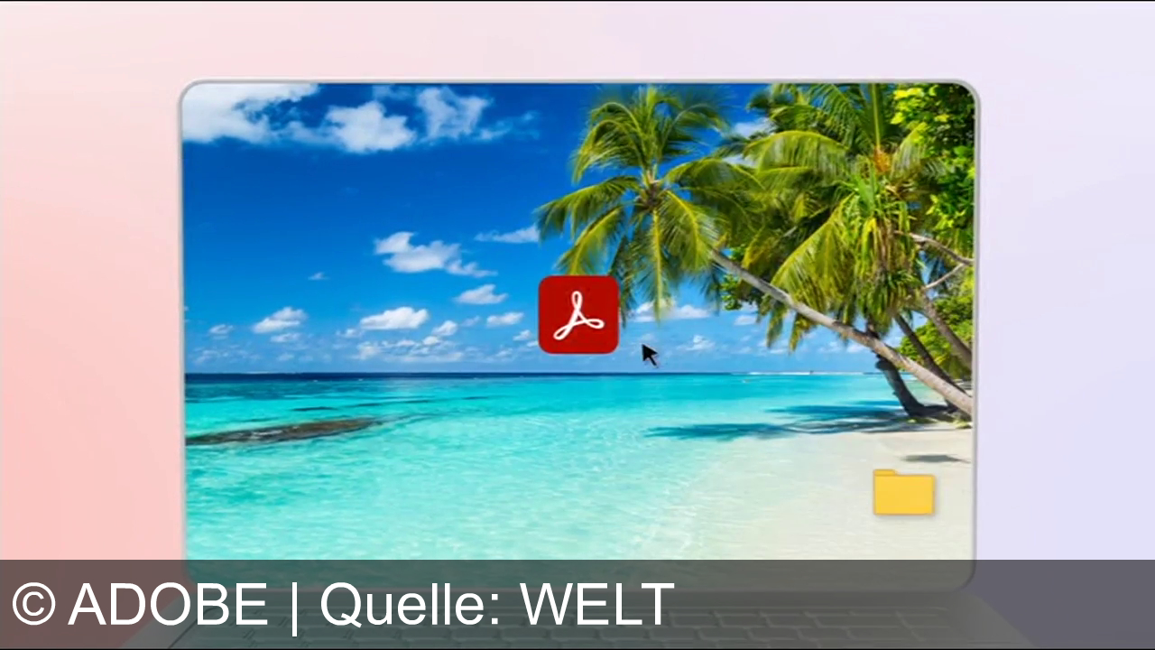 Ein Laptopbildschirm zeigt einen Strand mit Palmen und blauem Himmel. Ein rotes PDF-Symbol und ein gelber Ordner-Symbol sind sichtbar. Ein schwarzer Cursor ist in der Mitte. Der Hintergrund des Laptops ist rosa.
