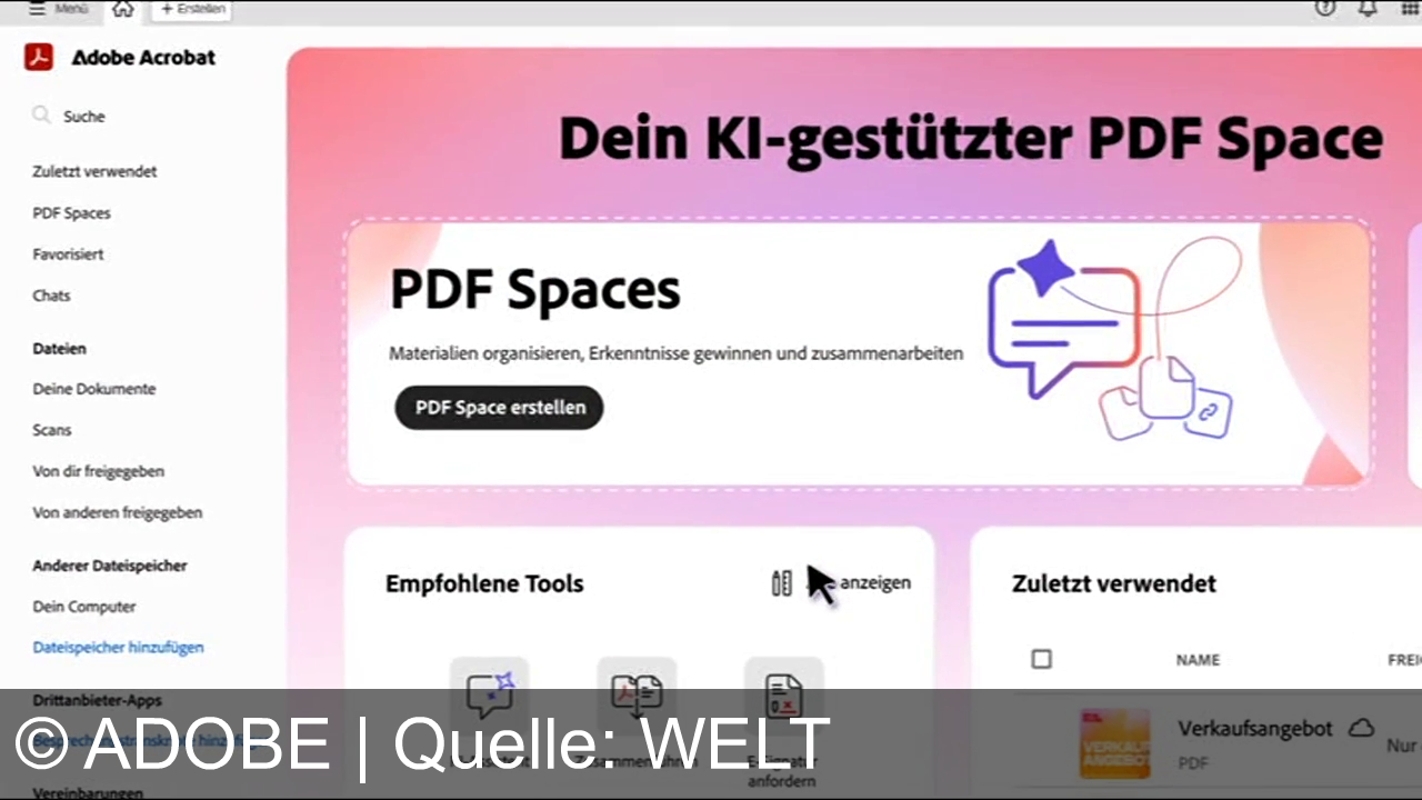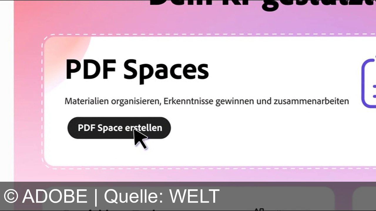 Ein Bild zeigt einen Werbeclipausschnitt mit dem Text „PDF Spaces.“ Ein Button „PDF Space erstellen“ ist zu sehen. Hintergrund in rosa und lila Tönen; ein Icon auf der rechten Seite. Der Text darunter lautet: „Materialien organisieren, Erkenntnisse gewinnen und zusammenarbeiten.“ Ein Mauszeiger zeigt auf den Button.