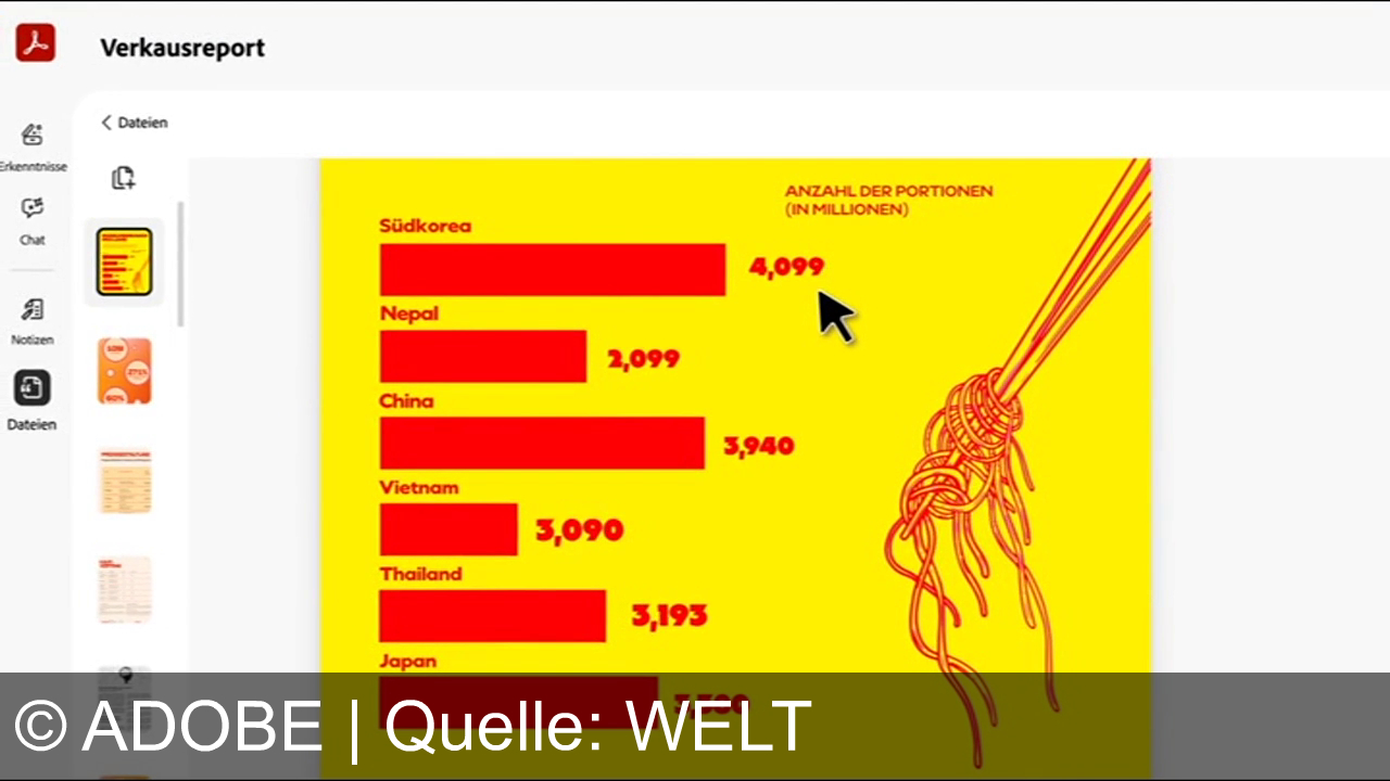 Ein gelbes Diagramm mit roten Balken zeigt die Anzahl der Portionen in Millionen für Südkorea (4,099), Nepal (2,099), China (3,940), Vietnam (3,090), Thailand (3,193) und Japan (3,380). Auf der rechten Seite greifen Essstäbchen rote Nudeln. Links ist ein PDF-Bereich mit Symbolen für Dateien, Erkenntnisse, Chat und Notizen sichtbar.