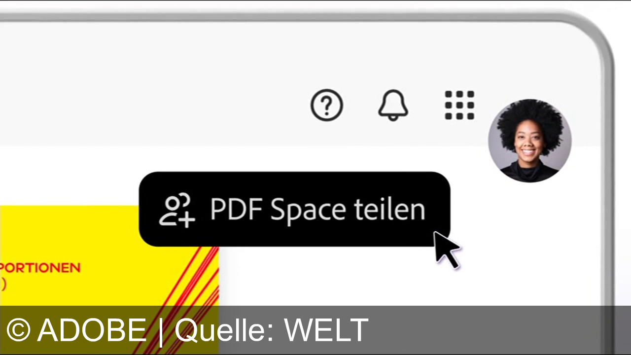Oben rechts eine Profilbild-Icon einer lächelnden Person. Daneben Symbole: Fragezeichen, Glocke, Raster. Ein schwarzer Tooltip „PDF Space teilen“ mit einem Pfeil daneben. Links unten gelber Hintergrund mit rotem Text und Linien.