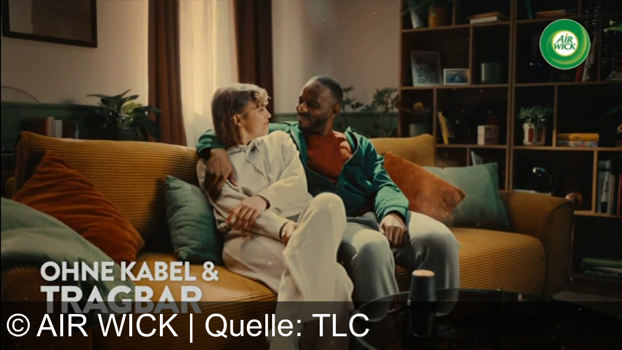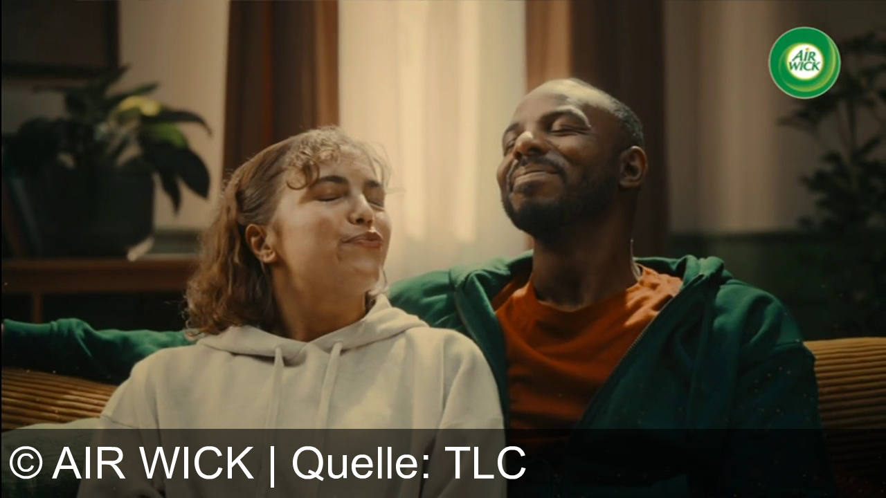Zwei Personen sitzen nebeneinander auf einem Sofa. Beide schauen sich an. Im Hintergrund sind Bücherregale zu sehen. Oben rechts ist das Air Wick Logo eingeblendet. Die beiden Personen tragen Freizeitkleidung; eine weiße Kapuzenjacke und ein rotes T-Shirt mit grünem Pullover darüber.
