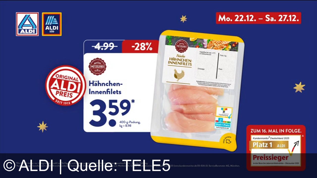 ALDI-Werbung mit Angebot für Hähnchen-Innenfilets. Der Preis ist von 4,99 € auf 3,59 € reduziert, 28% Rabatt. Links oben ALDI und ALDI Süd Logos. In der Mitte Verpackung der Hähnchenfilets. Rechts oben Angebotszeitraum vom 22.12. bis 27.12. Rechts 16. Preisstufe in Folge, Platz 1 in Kundenmonitor 2025. Blauer Hintergrund mit Sternen.