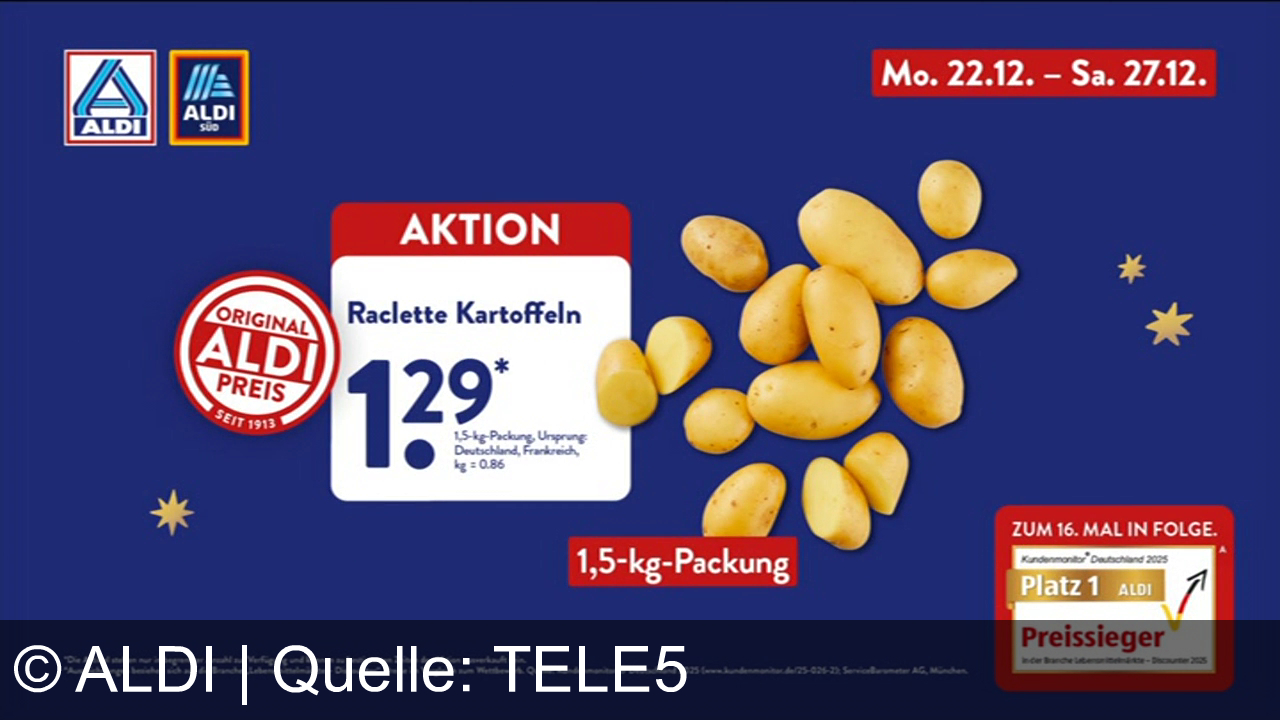 Raclette-Kartoffeln für 1,29 € in 1,5-kg-Packung, erhältlich bei Aldi. Ursprungsland: Deutschland, Frankreich. Angebot gilt vom 22.12. bis 27.12. Oben links und oben rechts die Aldi-Logos. Preis pro kg: 0,86 €. Hinweis auf Platz 1 bei Kundenmonitor Deutschland 2025 als Preissieger. Original Aldi Preis seit 1913. Hintergrund in Blau mit kleinen Sternen.