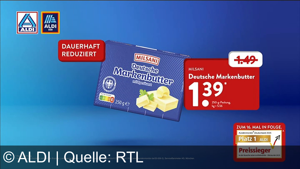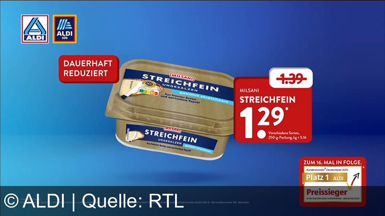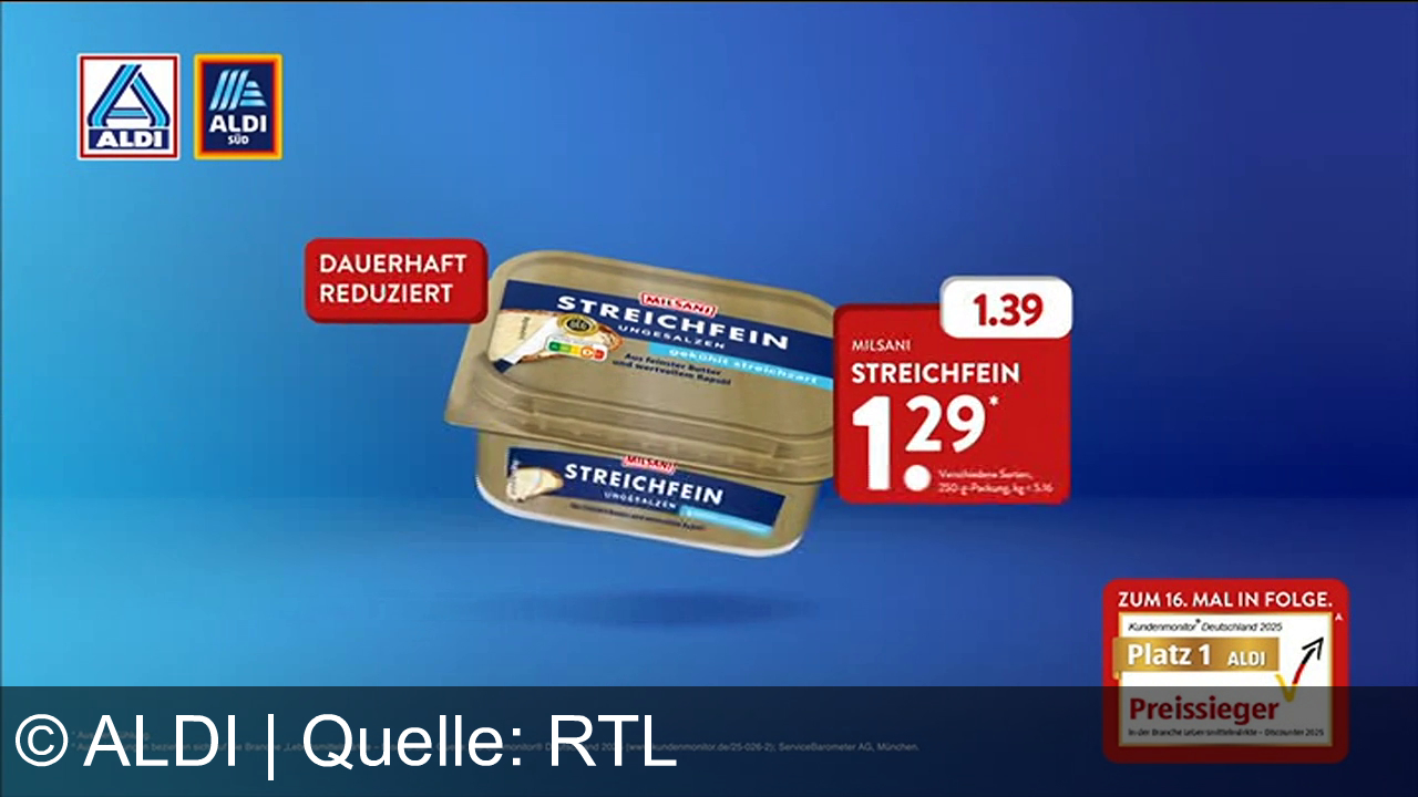 Werbung aus dem Jahr 2025 von Aldi in Deutschland, mit dem von uns gewählten Titel: "Aldi senkt dauerhaft Preise: Milsani Deutsche Markenbutter und Streichfein jetzt noch günstiger" mit der Kurzbeschreibung: "ALDI – Seit 1913: Original Aldi Preis. Milsani Deutsche Markenbutter schon ab 1,39 €, Streichfein ab 1,29 €. Deutschlands wahrer Preisieger. Gutes für alle – jetzt in deiner Filiale!". Diese Werbung thematisiert oder beinhaltet die Kategorie/n Butter, Lebensmittel, Supermarkt.