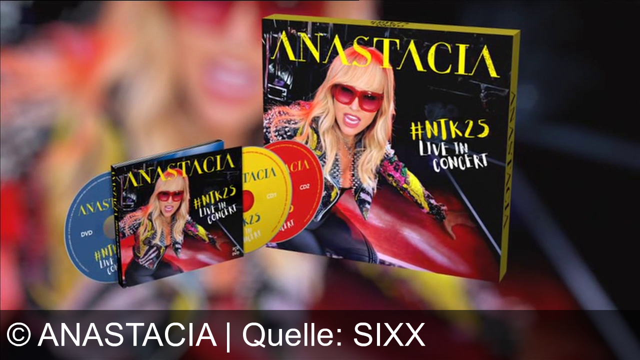 Eine Frau mit blonden Haaren und Sonnenbrille singt auf der Bühne, im Hintergrund spielt ein Gitarrist. Unten links ein Bild des Albums mit der gleichen Frau. Text: "ANASTACIA DAS LIVE ALBUM #NTK25 LIVE IN CONCERT".