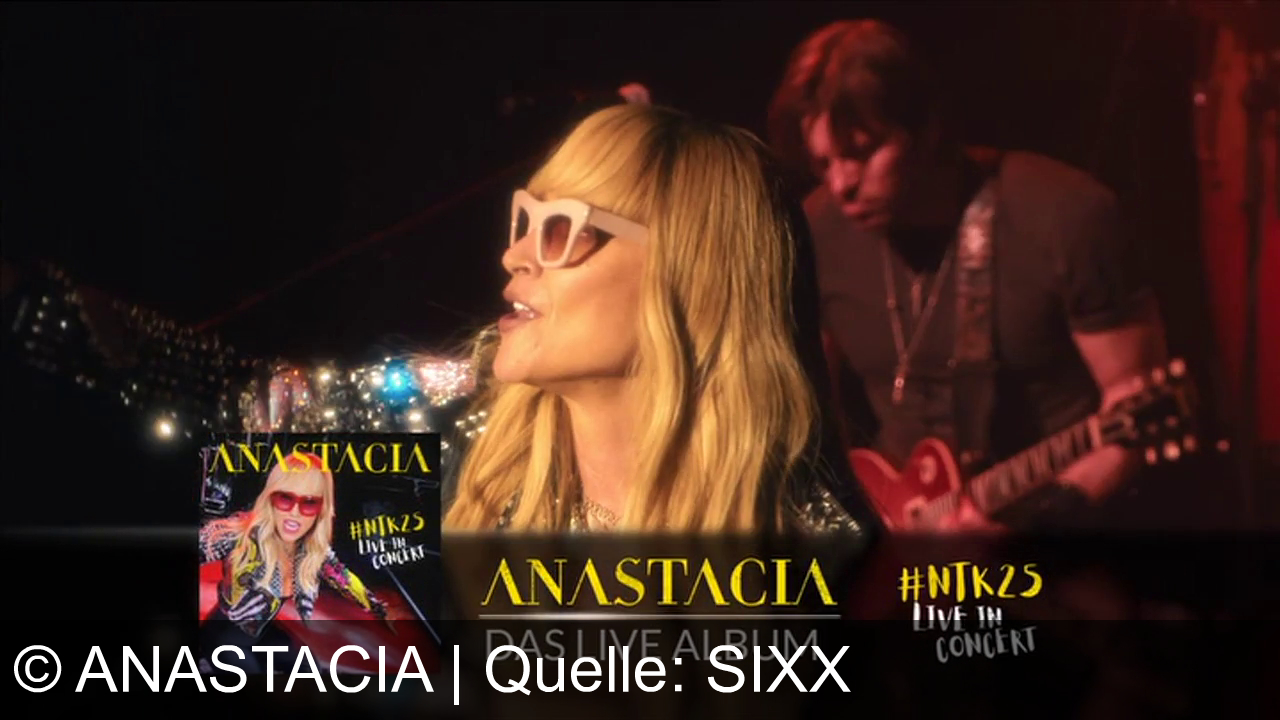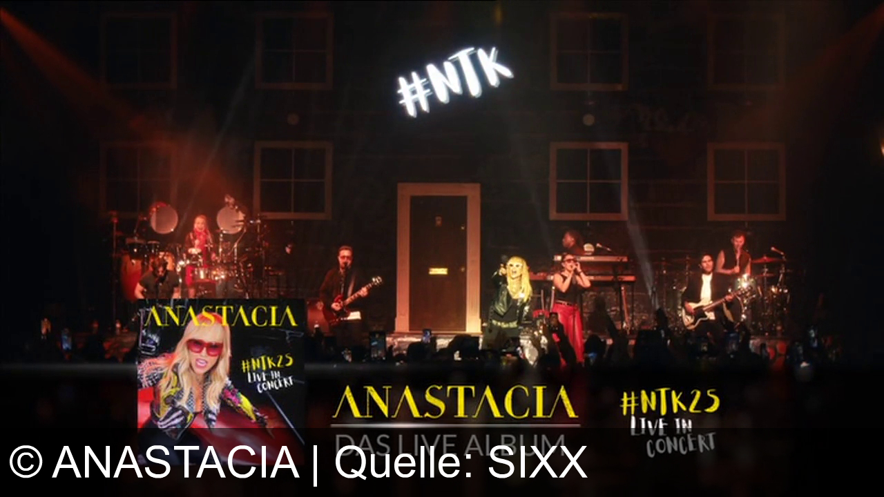 Eine Frau mit Sonnenbrille und Lederjacke steht auf einer Bühne, flankiert von Musikern mit Instrumenten. Oben leuchtet "#NTK". Unten links ist ein Albumcover mit derselben Frau abgebildet. Rechts davon steht "ANASTACIA" und "DAS LIVE ALBUM". Text darunter: "#NTK25 LIVE IN CONCERT". Zuschauer im Vordergrund.