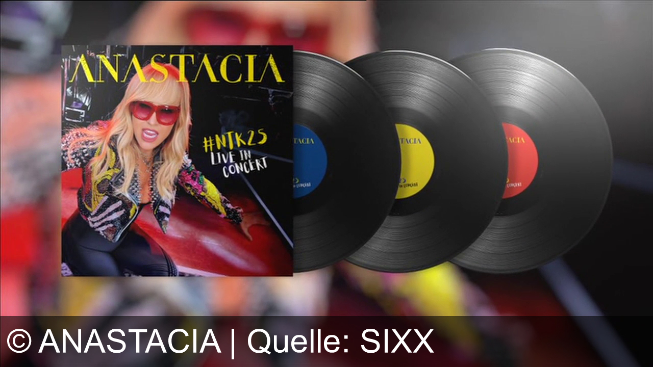 Ein Albumcover mit dem Schriftzug "ANASTACIA" und "#NTK25 LIVE IN CONCERT". Eine Frau mit Sonnenbrille und buntem Outfit ist abgebildet. Neben dem Cover sind drei schwarze Vinylplatten mit bunten Labels (blau, gelb, rot) sichtbar. Hintergrund ist unscharf und dunkel.