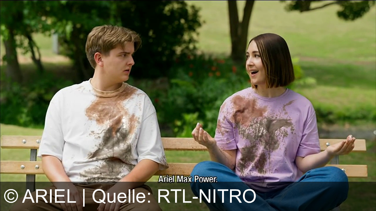 Zwei Leute sitzen auf einer Parkbank, beide voll mit Dreckflecken auf den Shirts. Der Typ schaut rüber, die Frau grinst und gestikuliert locker. Die Szene wirkt wie ein kurzer Austausch nach einer Aktion im Freien. Untertitel nennt Ariel Max Power.