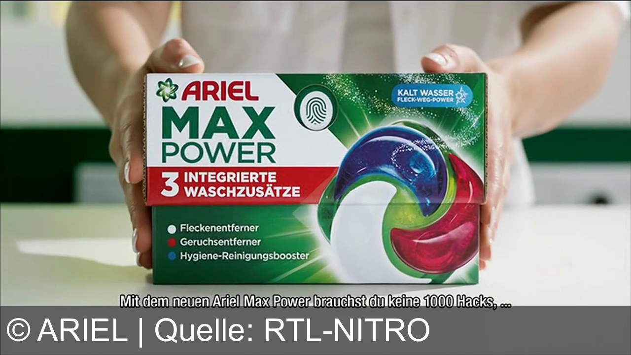 Zwei Hände halten eine Packung Ariel Max Power in die Kamera. Die Box zeigt ein großes Waschpad in bunten Farben und wirbt mit drei integrierten Waschzusätzen wie Flecken- und Geruchsentferner. Unten läuft ein kurzer Werbetext durchs Bild.
