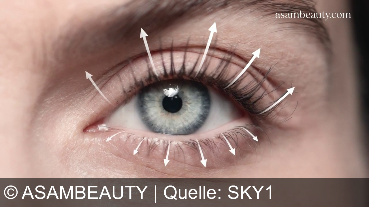 Nahaufnahme eines Auges mit weißen Pfeilen, die nach außen zeigen. Oben rechts steht “asambeauty.com”. Unten links ist ein kleiner Text.