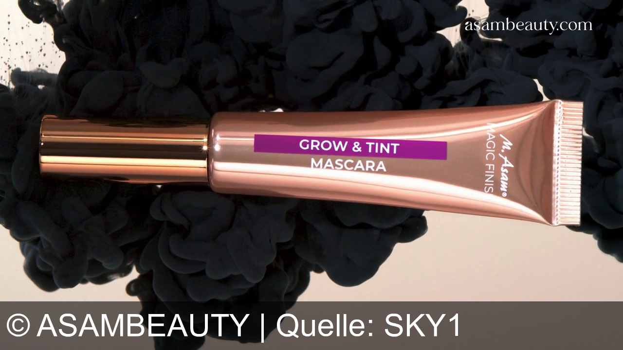 Ein rosa-goldenes Mascara-Röhrchen mit der Aufschrift "GROW & TINT MASCARA" schwebt vor einem schwarzen, wolkenartigen Hintergrund. Oben rechts steht "asambeauty.com".
