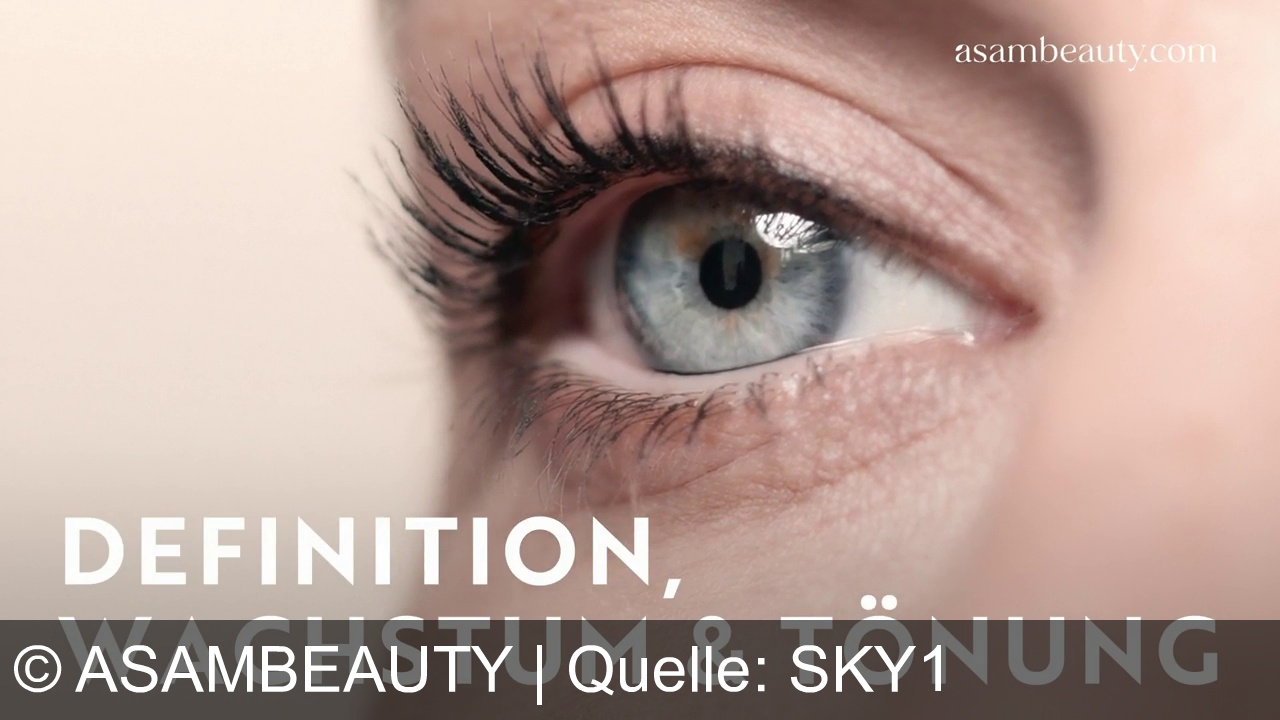 Ein Auge mit langen Wimpern im Fokus. Oben rechts steht eine Webadresse: asambeauty.com. Unten links die Begriffe "Definition, Wachstum & Tönung" in großer weißer Schrift. Der Hintergrund ist neutral gehalten.