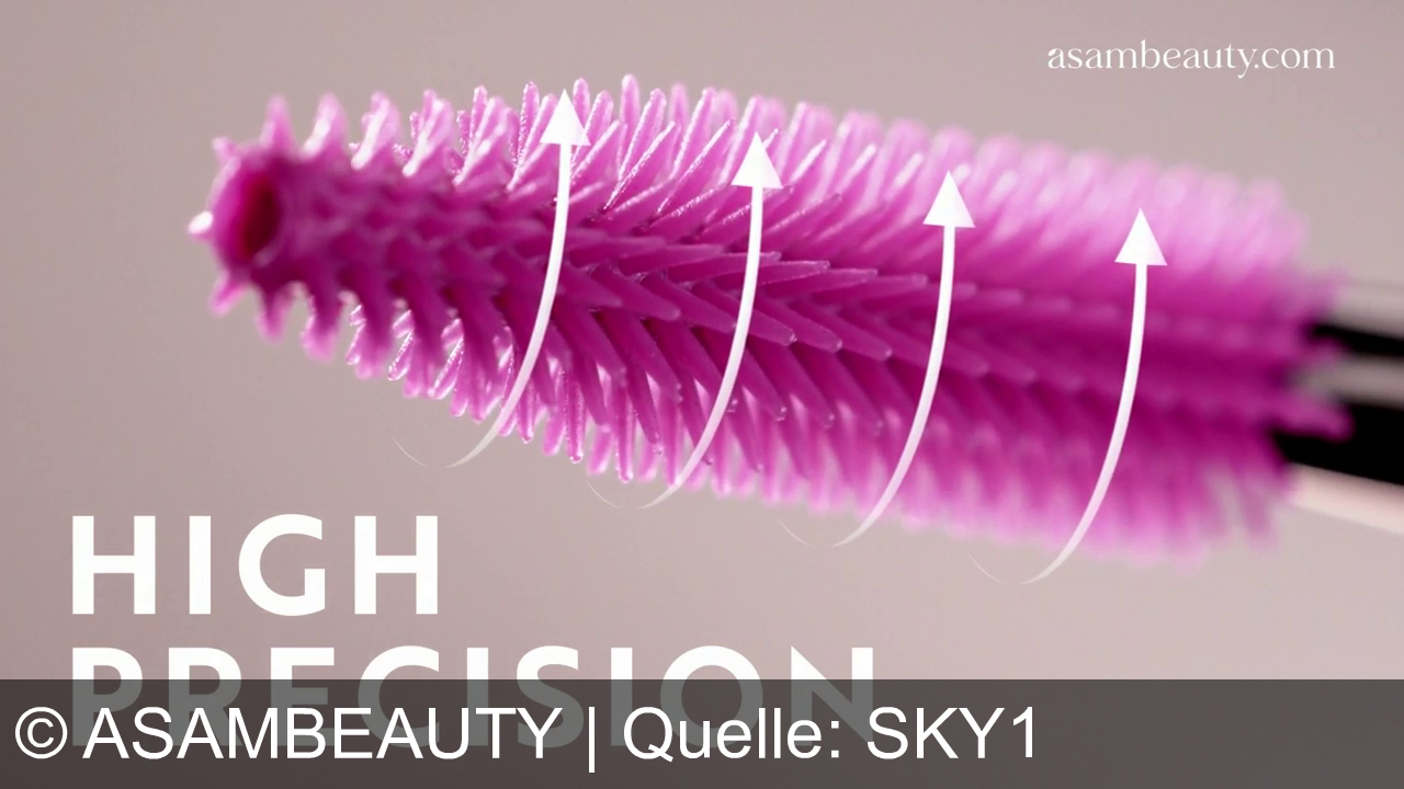 Eine Nahaufnahme von einem pinken Mascara-Bürstchen, mit mehreren weißen Pfeilen darauf. Oben rechts steht „asambeauty.com“. Links unten der Text „HIGH PRECISION“. Der Hintergrund ist beige.