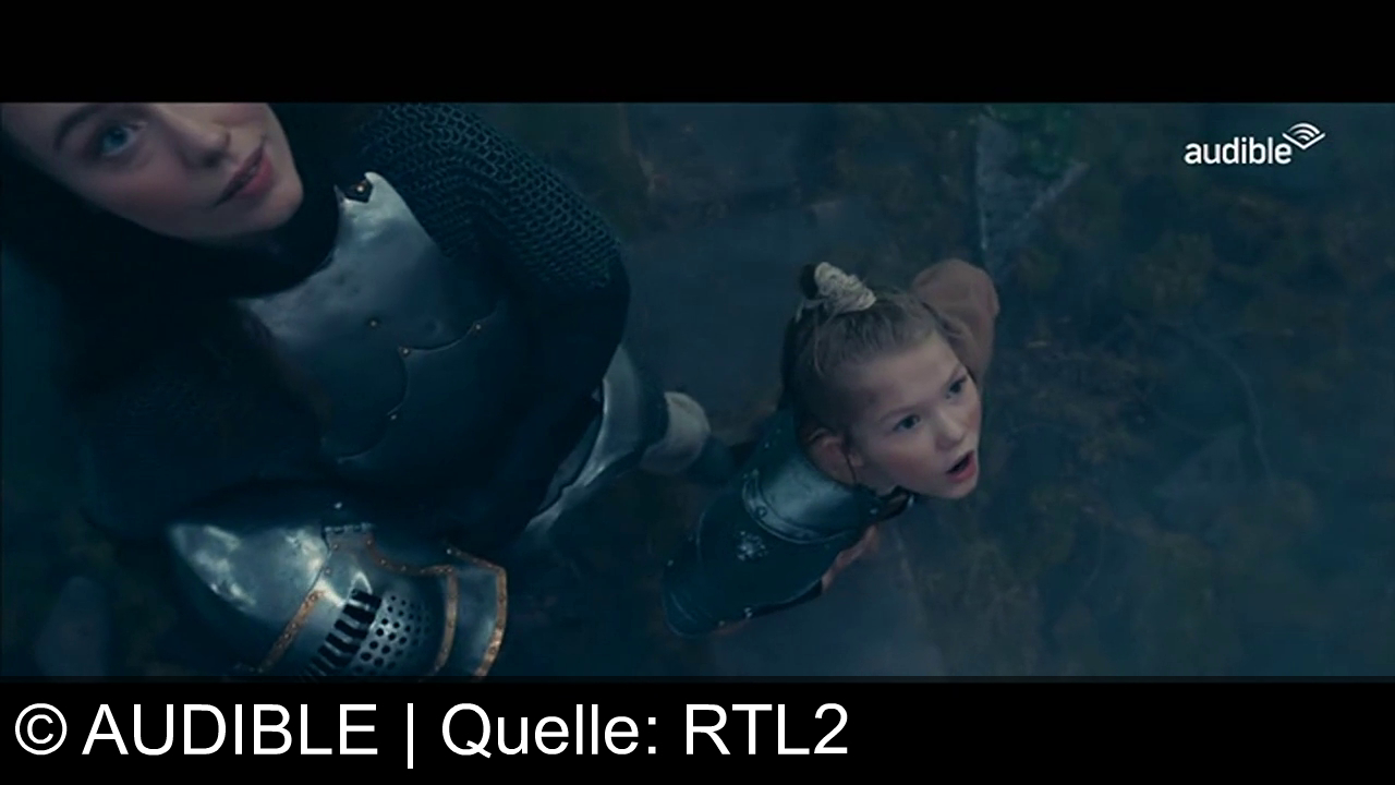 Zwei Personen in Ritterrüstungen schauen nach oben. Eine Frau links, ein Kind rechts, beide tragen Kettenhemden und metallene Brustpanzer. Das Audible-Logo ist oben rechts im Bild zu sehen.