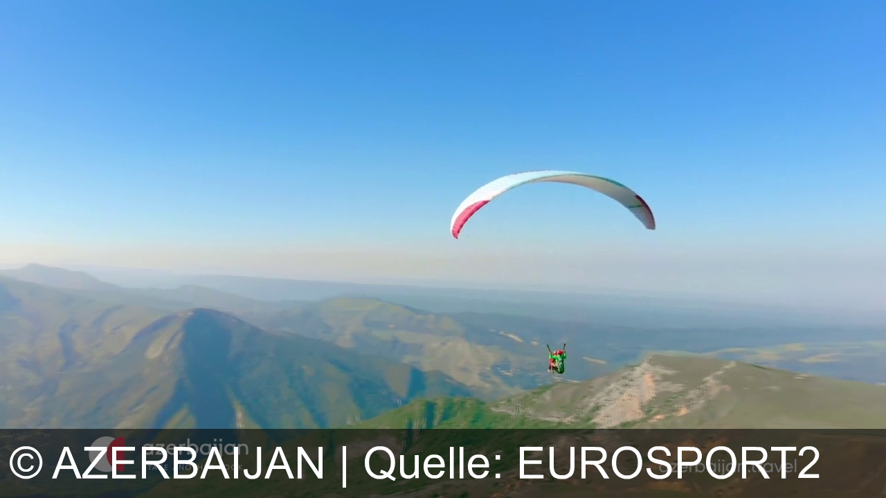 Ein Paraglider fliegt über eine bergige Landschaft. Der Himmel ist blau und die Sicht ist klar. Im unteren Bildbereich sind Logos und ein Slogan zu Aserbaidschan zu sehen.
