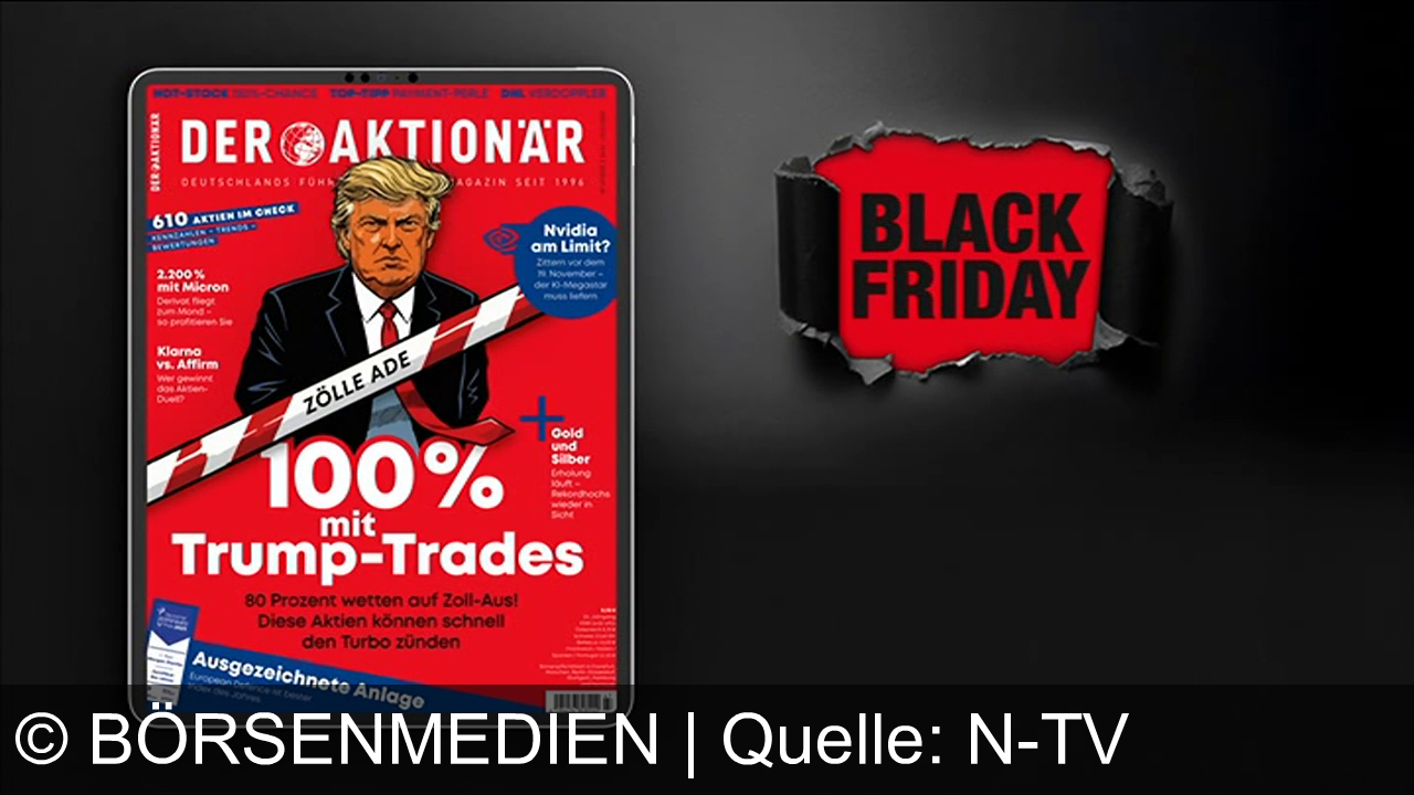 Links ein rotes Magazin-Cover "DER AKTIONÄR" mit einem gezeichneten Mann im Anzug. Text: "100% mit Trump-Trades", "Zölle Ade". Rechts daneben ein schwarzer Hintergrund mit einem roten, zerrissenen Papier, auf dem "BLACK FRIDAY" steht.