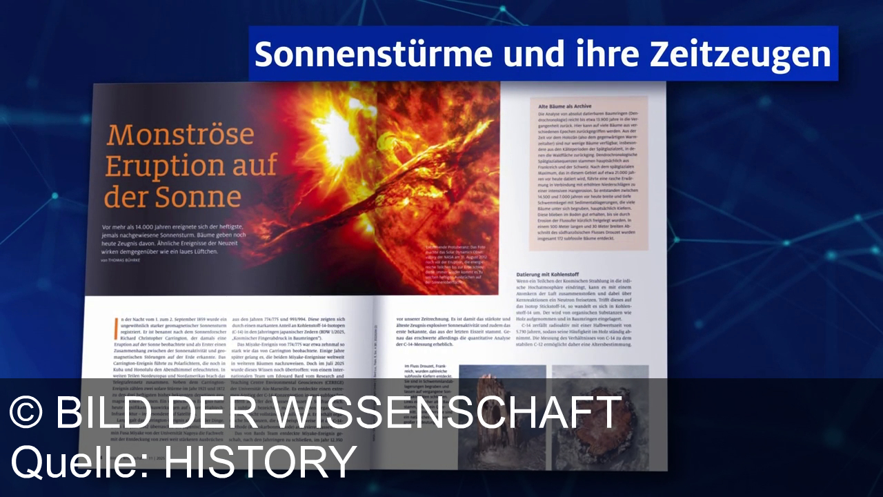 Ein Artikel wird gezeigt: "Monströse Eruption auf der Sonne". Rechts oben steht der Titel "Sonnenstürme und ihre Zeitzeugen". Links ein Bild von einer Sonneneruption. Unten Textblöcke über Sonnenstürme und Datierung mit Kohlenstoff. Zwei kleine Fotos unten rechts zeigen Baumringe. Der Hintergrund ist dunkelblau mit Netzmotiv.