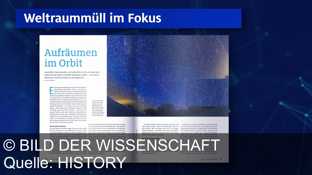 Oben steht in einem blauen Balken „Weltraummüll im Fokus“. Darunter ist eine Doppelseite eines Magazins zu sehen. Links sieht man den Text mit dem Titel „Aufräumen im Orbit“. Rechts ist ein Bild vom Nachthimmel mit vielen Punkten und Linien. Im Hintergrund ein dunkler, verschwommener Hintergrund mit Linienmuster.