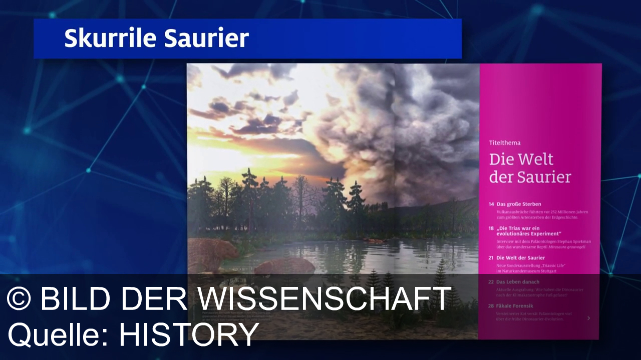 Links Textfeld in Blau mit "BDW - Die neue Ausgabe, Jetzt am Kiosk oder unter www.wissenschaft.de/einzelheft". Rechts Magazincover mit Titel "BILD DER WISSENSCHAFT", Thema "Die Welt der Saurier", Bild von einem Dinosaurier im Dschungel. Hintergrund mit abstrakten blauen Linien.