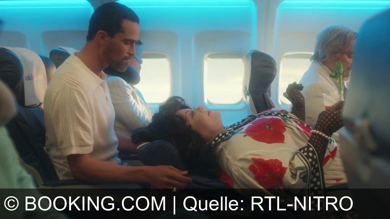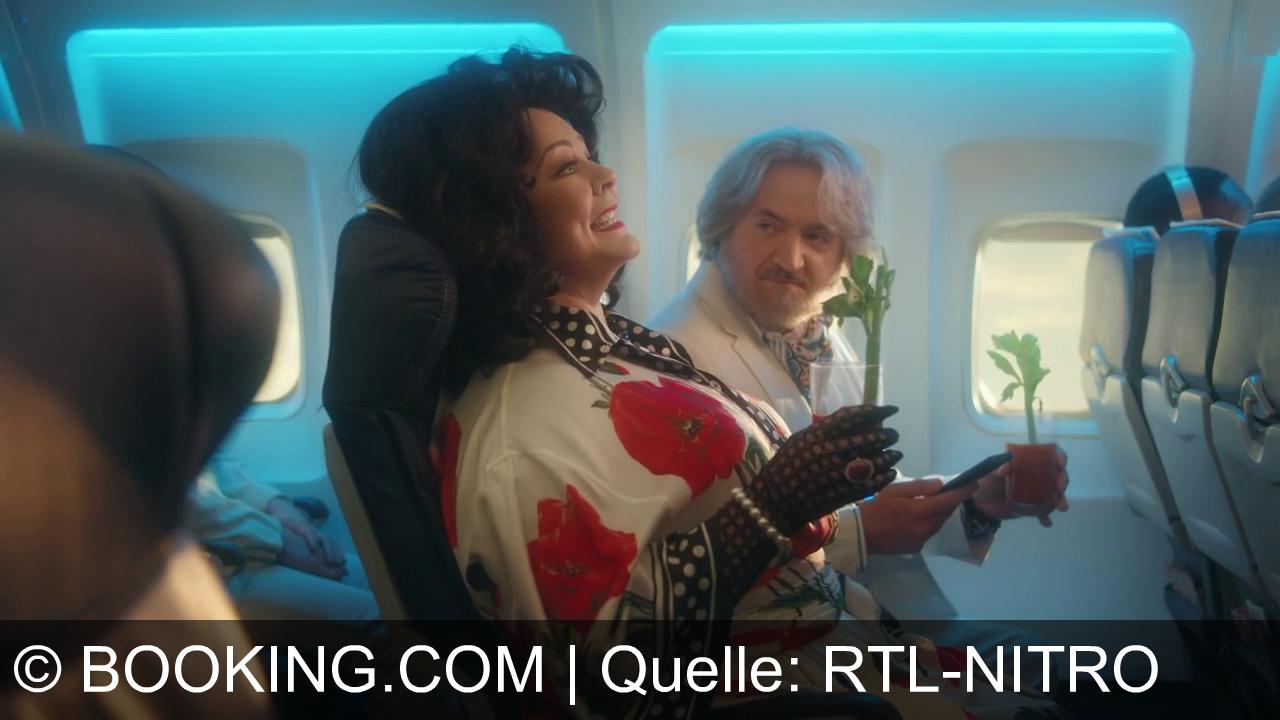 Eine Frau und ein Mann sitzen in einem Flugzeug. Die Frau hält ein Getränk mit Selleriestange. Beide tragen auffällige Kleidung; die Frau eine gemusterte Bluse mit Punkten und Blumen, der Mann ein weißes Jackett mit Halstuch. Im Hintergrund sind weitere Passagiere und eine Flugbegleiterin zu sehen. Auf den Sitzlehnen steht „Booking.com“.