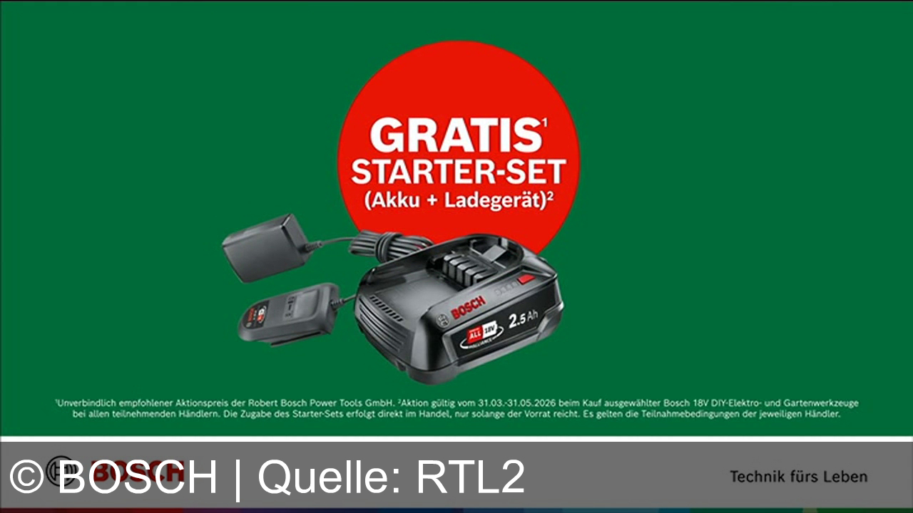 Auf grünem Hintergrund steht ein roter Kreis mit dem Hinweis auf ein gratis Starter-Set. Daneben liegen ein Akku und ein passendes Ladegerät von Bosch. Unten läuft ein weißer Balken mit Logo und Slogan durch.