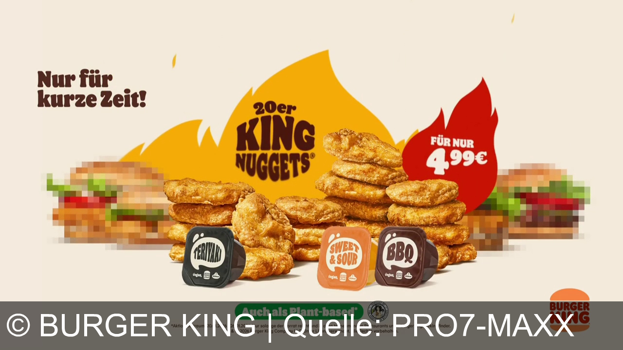 Burger King Werbung aus dem Jahr 2026 in Deutschland, mit dem von uns gewählten Titel: "Burger King: 20er King Nuggets – klassisch oder plant-based – jetzt für nur 4,99 € sichern!" mit der Kurzbeschreibung: "Schnapp dir jetzt die 20er King Nuggets für nur 4,99 € – ob klassisch oder Plant-based. Fünf Wochen, fünf Schnapper – nur bei Burger King!". Diese Werbung thematisiert oder beinhaltet die Kategorie/n Pommes, Fleisch-Aus-Pflanzen-Vegetarisch-Vegan, Lebensmittel, Chips & Snacks.