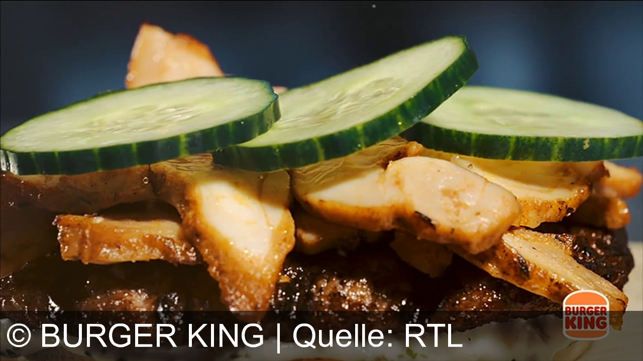 Zwei Scheiben Gurke liegen auf gegrilltem Fleisch und Hähnchenstücken. Darunter ist eine helle Soße. Unten rechts ist das Burger King Logo sichtbar.