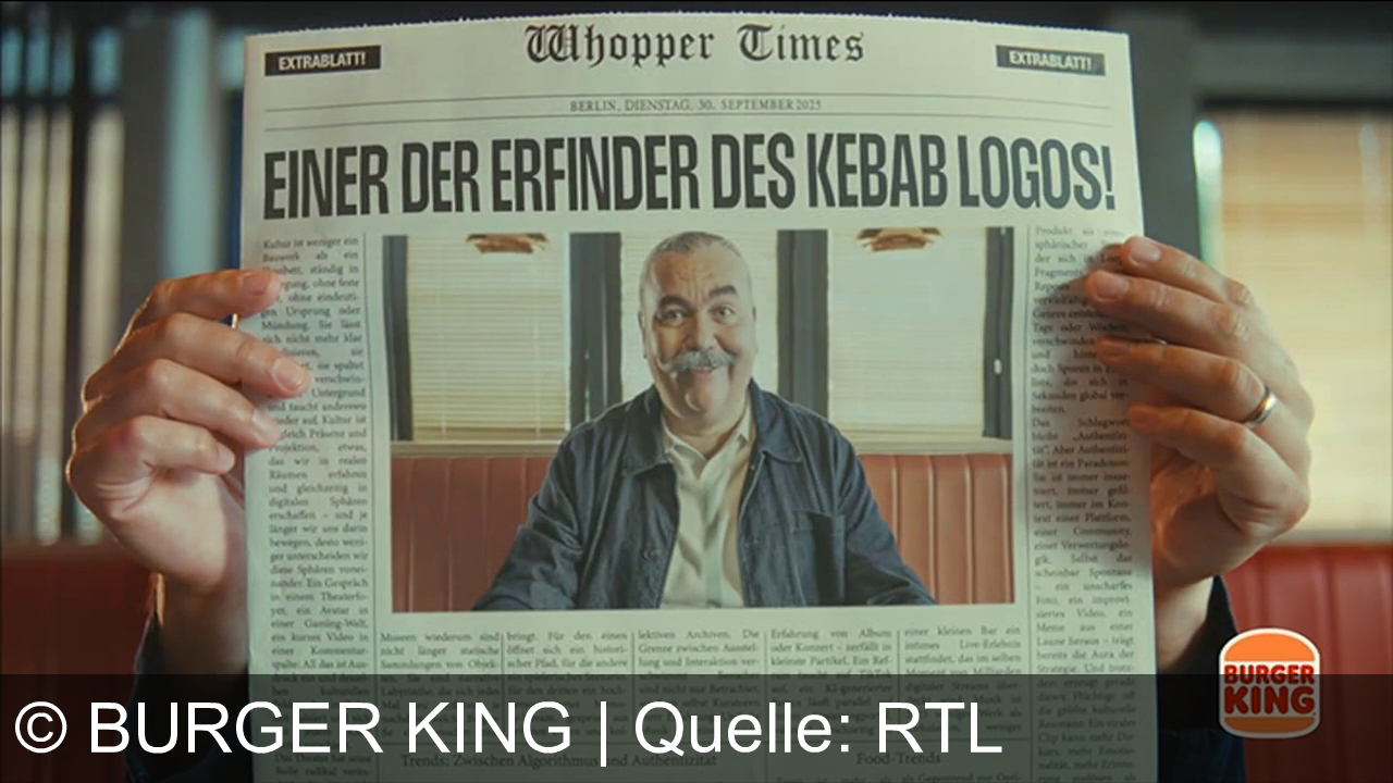 Eine Zeitung wird von zwei Händen gehalten. Der Titel lautet "EINER DER ERFINDER DES KEBAB LOGOS!". Ein Mann mit Schnurrbart lächelt in die Kamera. Links und rechts stehen Artikeltexte. Unten rechts befindet sich ein Burger King Logo. Die Zeitung heißt "Whopper Times" und das Datum ist der 30. September 2025.