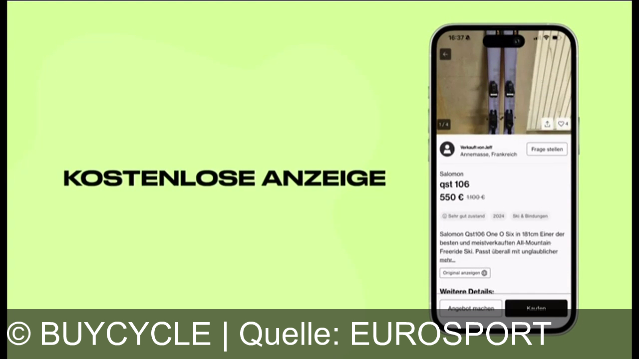 Werbung aus dem Jahr 2025 von Buycycle in Deutschland, mit dem von uns gewählten Titel: "Mit der Buycycle App gebrauchtes Sportequipment kostenlos inserieren und schnell verkaufen" mit der Kurzbeschreibung: "Altes Sportequipment loswerden? Mit der Buycycle-App schnell und kostenlos inserieren – erreiche Millionen! Jetzt verkaufen auf www.buycycle.com, im App Store und bei Google Play.". Diese Werbung thematisiert oder beinhaltet die Kategorie/n Fahrrad, Ski, Sportschuhe, Sportkleidung, Tennis, Second Hand.