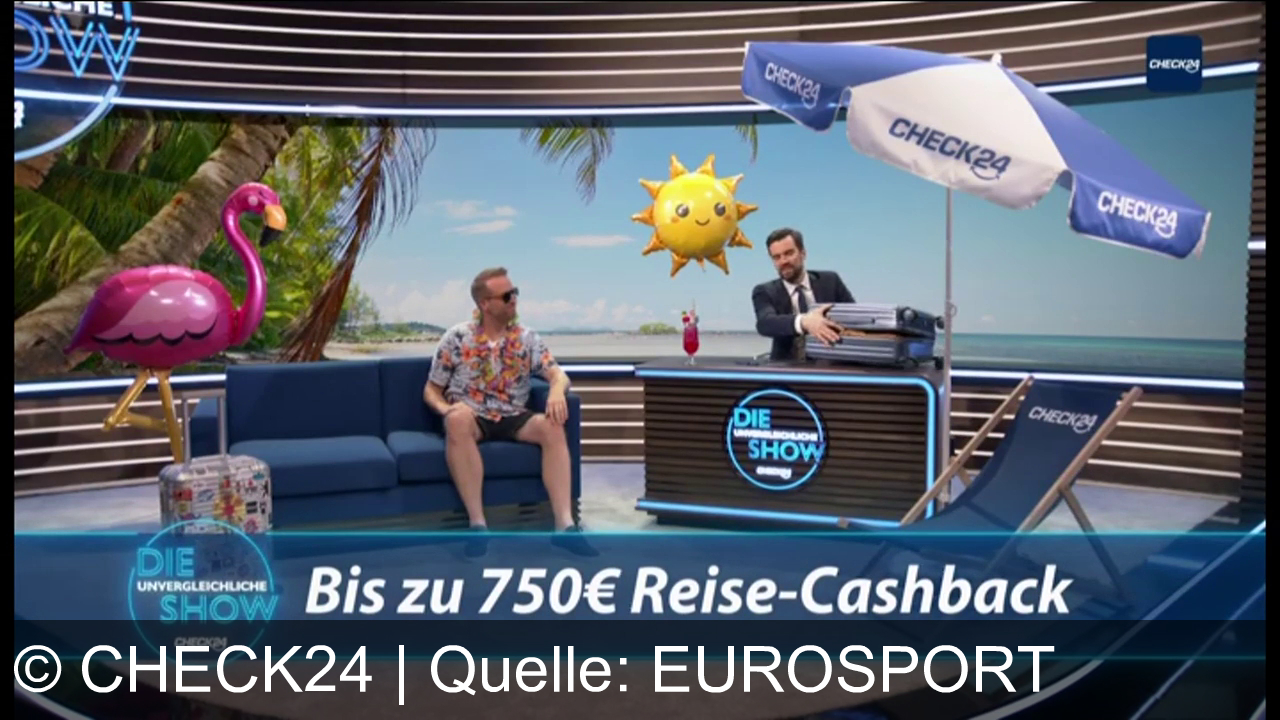 Ein Mann in einem bunten Hemd sitzt auf einem blauen Sofa neben einem pinken Flamingo. Ein anderer Mann sitzt an einem Schreibtisch mit einem Sonnenschirm darüber, beide mit "Check24" Logos. Eine lachende Sonne schwebt im Hintergrund und es gibt einen Text mit "Bis zu 750€ Reise-Cashback" auf einem Banner unten im Bild. Ein Strand ist im Hintergrund sichtbar.
