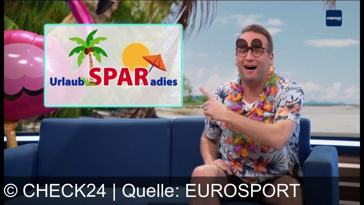 Ein Mann auf einem blauen Sofa trägt Hawaii-Hemd, Sonnenbrille und Blumenketten. Er zeigt auf ein Schild mit der Aufschrift „Urlaub Sparadies“. Im Hintergrund sind Palmen und ein Strand zu sehen, links ein rosa Flamingo-Luftkissen. In der Ecke steht "CHECK24".