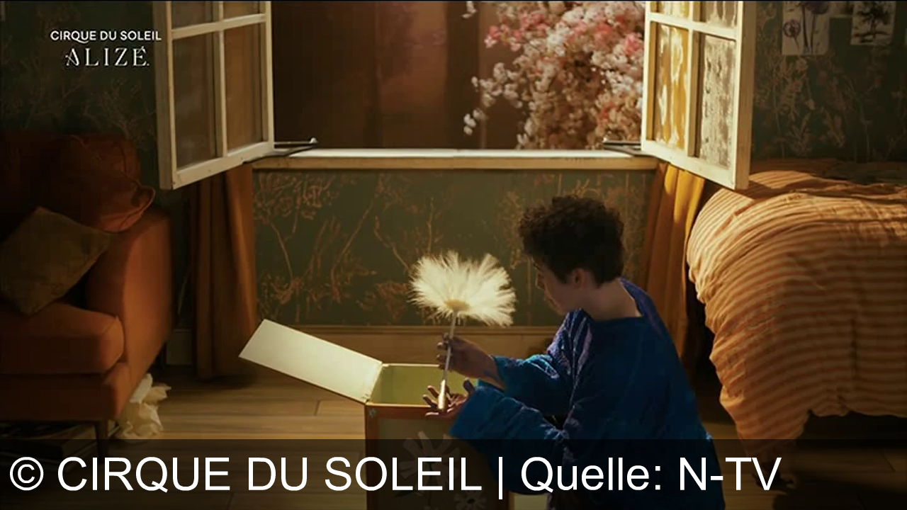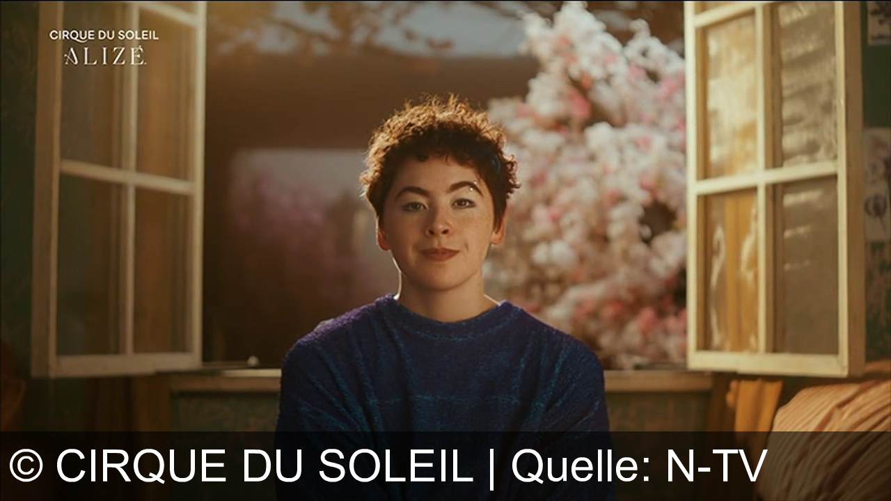 Eine Person sitzt vor einem offenen Fenster, trägt einen blauen Pullover. Im Hintergrund blüht ein Baum mit rosa und weißen Blüten. In der oberen linken Ecke steht "Cirque du Soleil" und darunter "ALIZÉ". Die Szene ist warm beleuchtet.