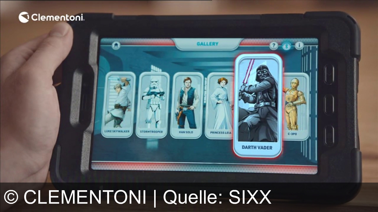 Eine Hand hält ein Tablet mit Star Wars-Charakteren auf dem Bildschirm. Von links nach rechts sind Luke Skywalker, ein Stormtrooper, Han Solo, Prinzessin Leia, Darth Vader (hervorgehoben) und C-3PO zu sehen. Oben links steht "Clementoni". Oben im Displaytitel steht "Gallery".