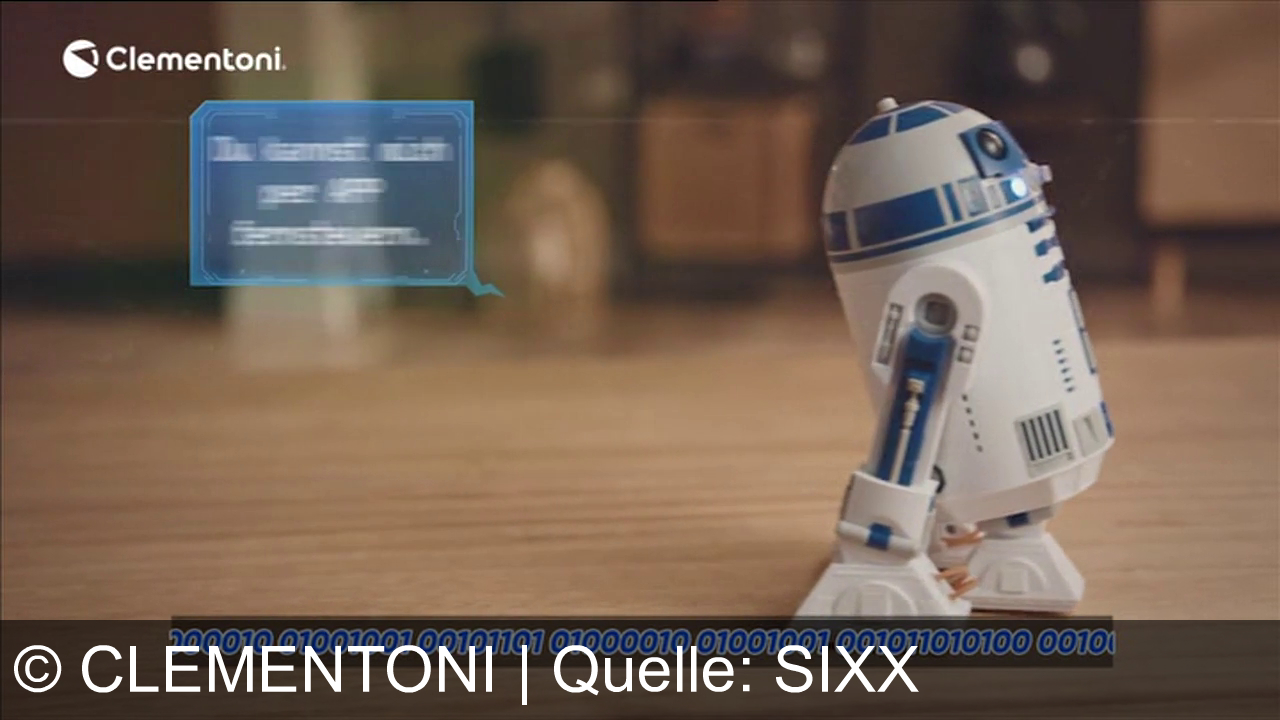 Ein R2-D2-Roboter steht auf einem Holztisch. Links oben das Logo "Clementoni". Eine Sprechblase zeigt: "Du kannst mich per App fernsteuern." Unten eine Reihe binärer Zahlen. Im Hintergrund unscharfe Möbel.