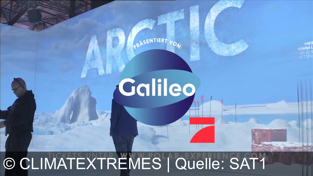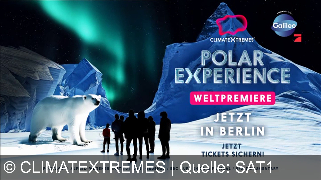 Ein Eisbär steht vor eisigen Felsen, darüber leuchtet das Nordlicht. Im Vordergrund sind silhouettierte Menschen. Auf der rechten Seite steht: "ClimateXtremes Polar Experience Weltpremiere, jetzt in Berlin, jetzt Tickets sichern!". Logos von Galileo und Pro7, Hinweise zu Urheberrechten unten.