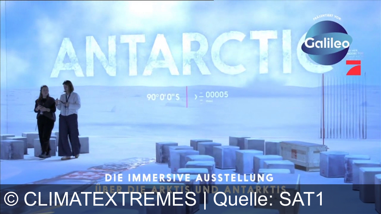 Zwei Personen stehen in einer Ausstellung. Der Hintergrund zeigt das Wort "ANTARCTIC" in großen Buchstaben. Blöcke auf dem Boden wirken wie Eiswürfel. Unten steht: "DIE IMMERSIVE AUSSTELLUNG ÜBER DIE ARKTIS UND ANTARKTIS". Oben rechts sind die Logos von Galileo und ProSieben.