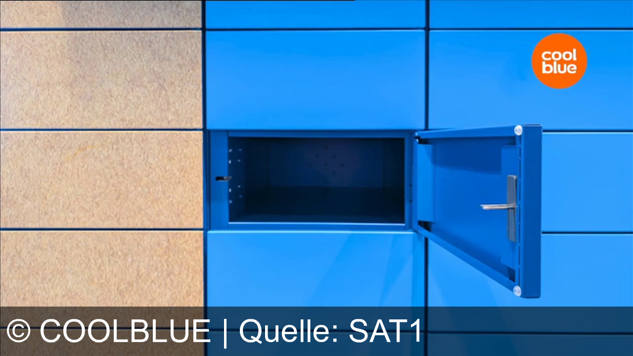 Ein blaues Paketfach hängt in einer Wand, die Tür steht offen und zeigt ein leeres Fach. Links daneben sitzen beige Platten. Ein orangefarbener Kreis mit dem Wort coolblue klebt oben rechts.