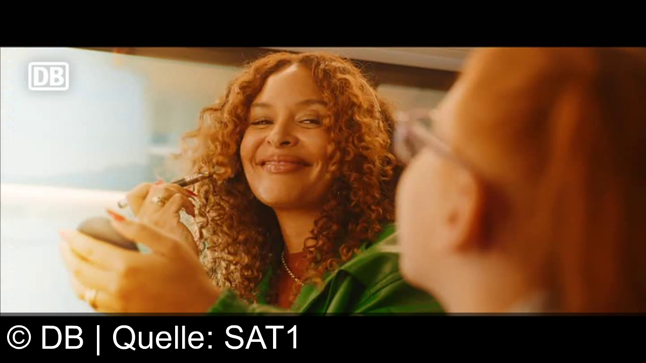Eine Frau mit lockigem Haar lächelt und hält einen Schminkspiegel und einen Pinsel. Sie trägt eine grüne Jacke. Eine andere Person mit Brille schaut zu ihr. Links oben das Logo „DB“. Die Szene wirkt hell und freundlich.