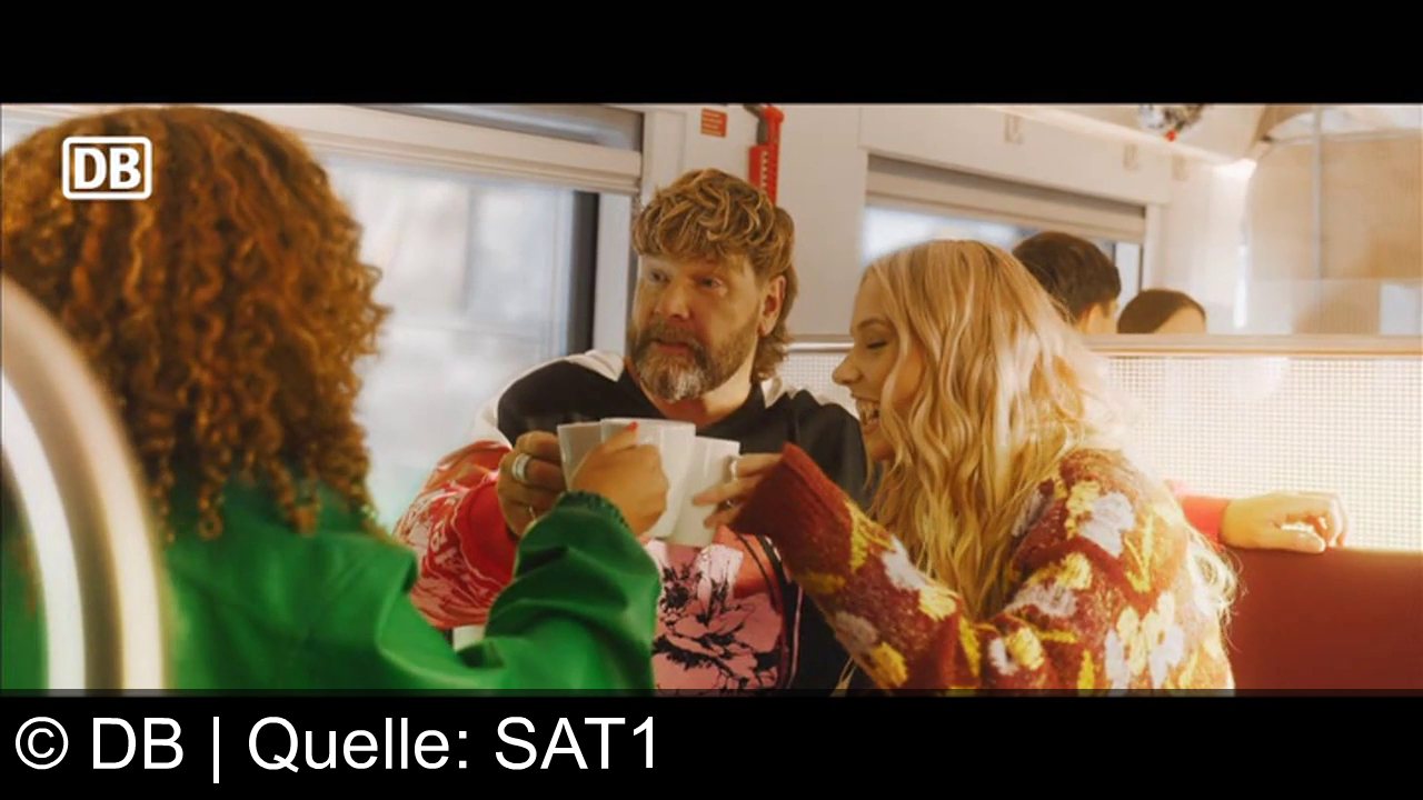 Drei Personen sitzen in einer Bahn und stoßen mit Tassen an. Der Mann in der Mitte hat einen Bart und trägt einen Pullover mit rotem Muster. Links eine Person mit lockigen Haaren im grünen Outfit. Rechts eine Frau mit blonden Haaren in einem gemusterten Pullover. Fenster im Hintergrund. Oben links ein DB-Logo.