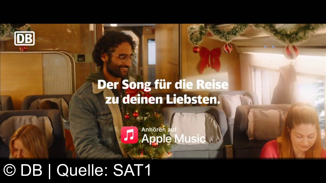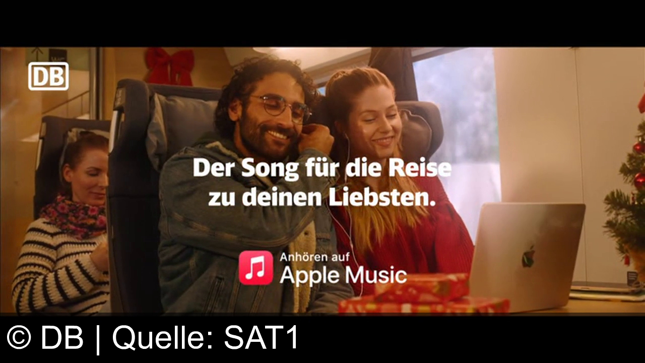 Zwei Personen sitzen in einem Zugabteil und teilen Kopfhörer. Ein Laptop ist auf dem Tisch, daneben liegen Geschenke. Im Hintergrund ein kleiner Weihnachtsbaum. Oben links das DB-Logo. Text: "Der Song für die Reise zu deinen Liebsten. Anhören auf Apple Music." Eine Frau im Hintergrund schaut auf ihr Handy.