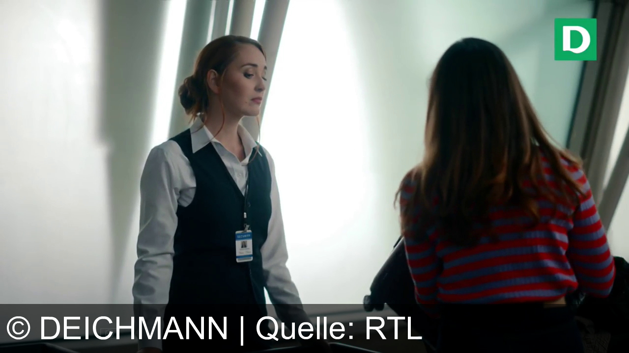 Zwei Frauen stehen sich gegenüber. Eine trägt eine Uniform mit Namensschild, die andere einen gestreiften Pullover. Die Uniformierte hat die Augen geschlossen und wirkt konzentriert. Im Hintergrund sind helle Fenster zu sehen, oben rechts ein grünes Symbol mit einem weißen "D".
