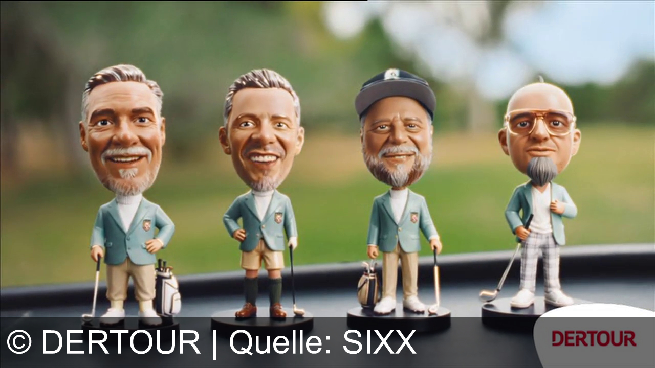 Vier Wackelkopffiguren mit großen Köpfen stehen nebeneinander auf einem Tisch. Sie tragen blaue Jacken und Golfkleidung. Jede Figur hält einen Golfschläger. Im Hintergrund sind unscharf Bäume und Wiese zu sehen. Unten rechts das Logo "Dertour".