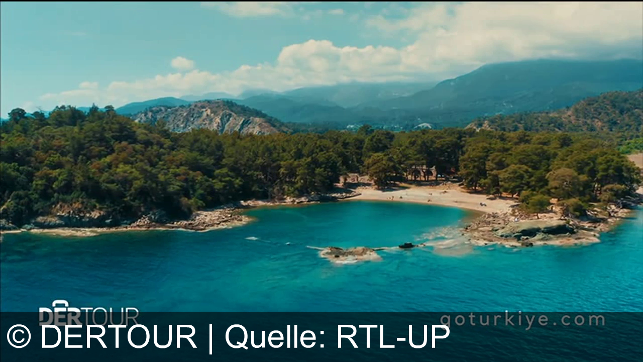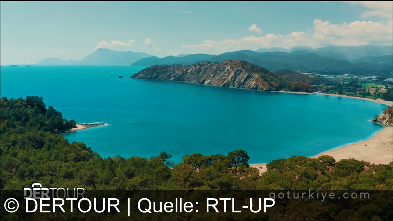 Ein türkisfarbenes Meer mit einer kleinen Bucht, umgeben von bewaldeten Hügeln. Sandstrand zieht sich entlang der Küste, dahinter grüne Wälder. Einige kleine Felsen ragen aus dem Wasser. Logo von DERTour und Webseite goturkiye.com unten im Bild. Wolken und Berge am Horizont.