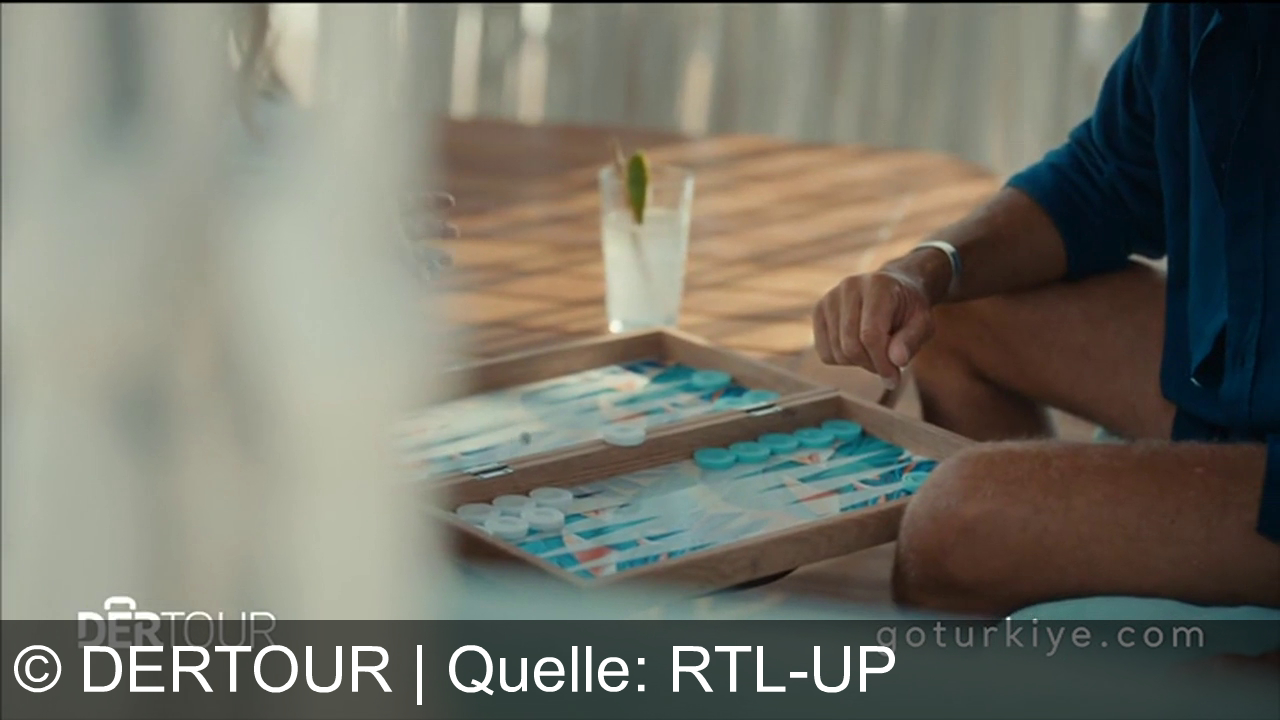 Ein Mann sitzt an einem Tisch und spielt Backgammon. Er trägt ein dunkelblaues Oberteil und ein silbernes Armband. Auf dem Tisch steht ein Getränk in einem Glas mit einer Limettenscheibe. Unten im Bild sind die Logos von "DER TOUR" und "goturkiye.com" zu sehen.